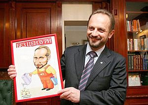 Журналисты газеты "Без цензуры" подарили Бессмертному дружеский шарж, а исполняющий обязанности председателя исполкома партии Александр Ропотенко презентовал имениннику набор инструментов для сада. По-видимому, Роман Петрович обрадовался такому подарку, поскольку сам недавно рассказывал, что очень любит ковыряться в саду.