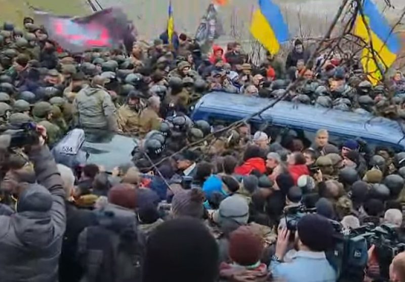 Активисты складывают обломки на углу этих двух улиц, перекрывая дорогу. В свою очередь, правоохранители пытаются помешать этому и забрать с проезжей части элементы забора.