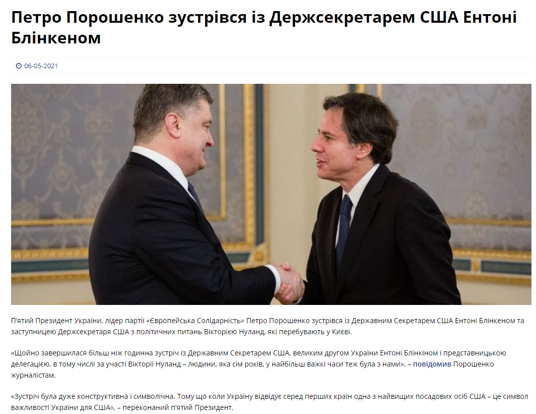 Отметим, сообщение о встрече Блинкена с Порошенко на сайте «Европейской солидарности» использует схожий подход – опубликовано старое фото. Лишь в последнем абзаце упоминается, что встреча состоялась в рамках встречи Госсекретаря США с главами фракций ВР.