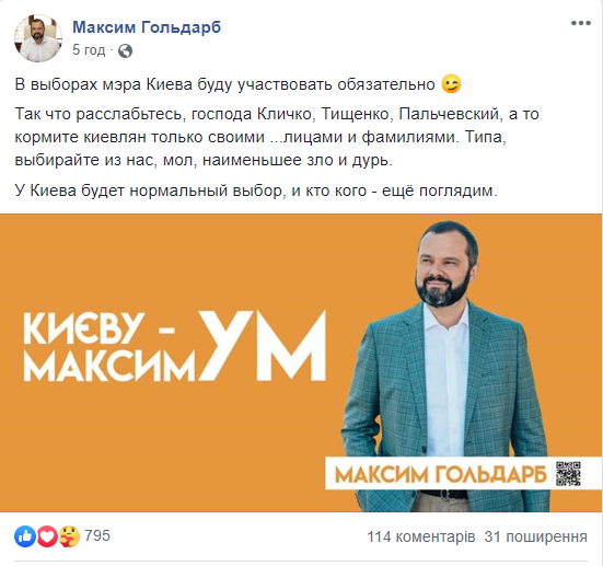 "В выборах мэра Киева буду участвовать обязательно. Так что расслабьтесь, господа Кличко, Тищенко, Пальчевский, а то кормите киевлян только своими… лицами и фамилиями. У Киева будет нормальный выбор, и кто кого – ещё поглядим", – уверен Гольдарб.
