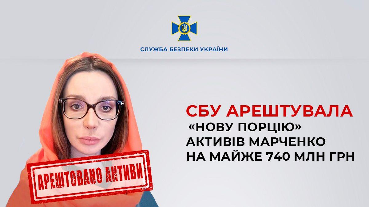 Служба безопасности Украины арестовала активы Оксаны Марченко, которая является женой Виктора Медведчука, кума президента России Владимира Путина, на сумму почти 740 миллионов гривень.
