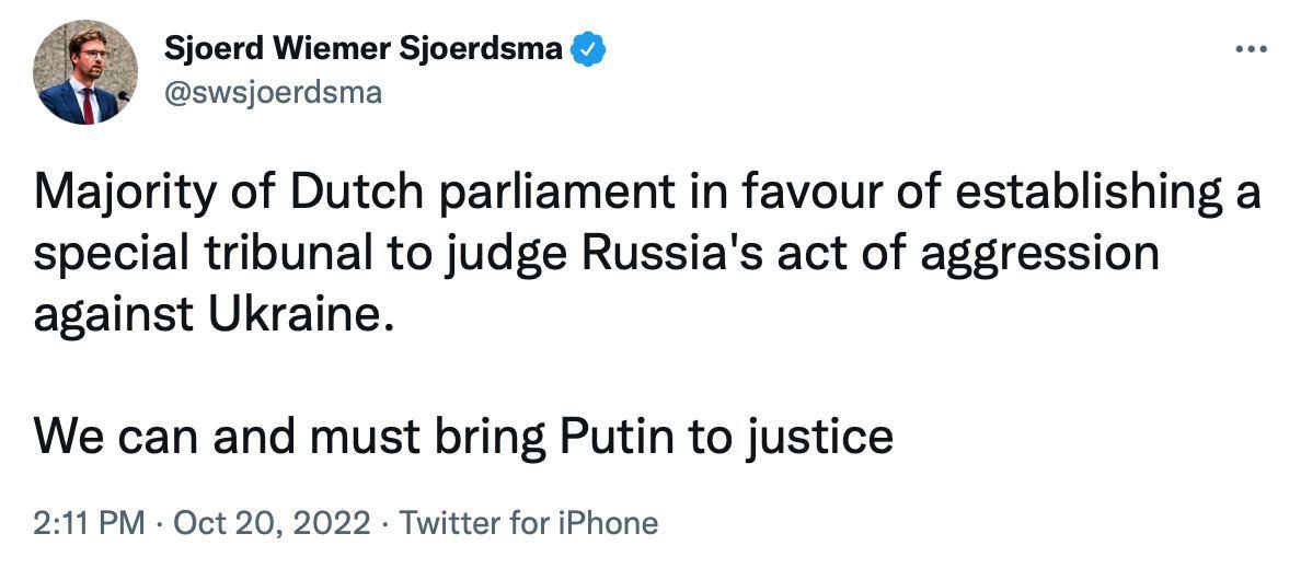 Как сообщил депутат от партии D66 Серд Вимер Сердсма, большинство парламента Нидерландов выступает за создание специального трибунала для рассмотрения акта агрессии россии против Украины.