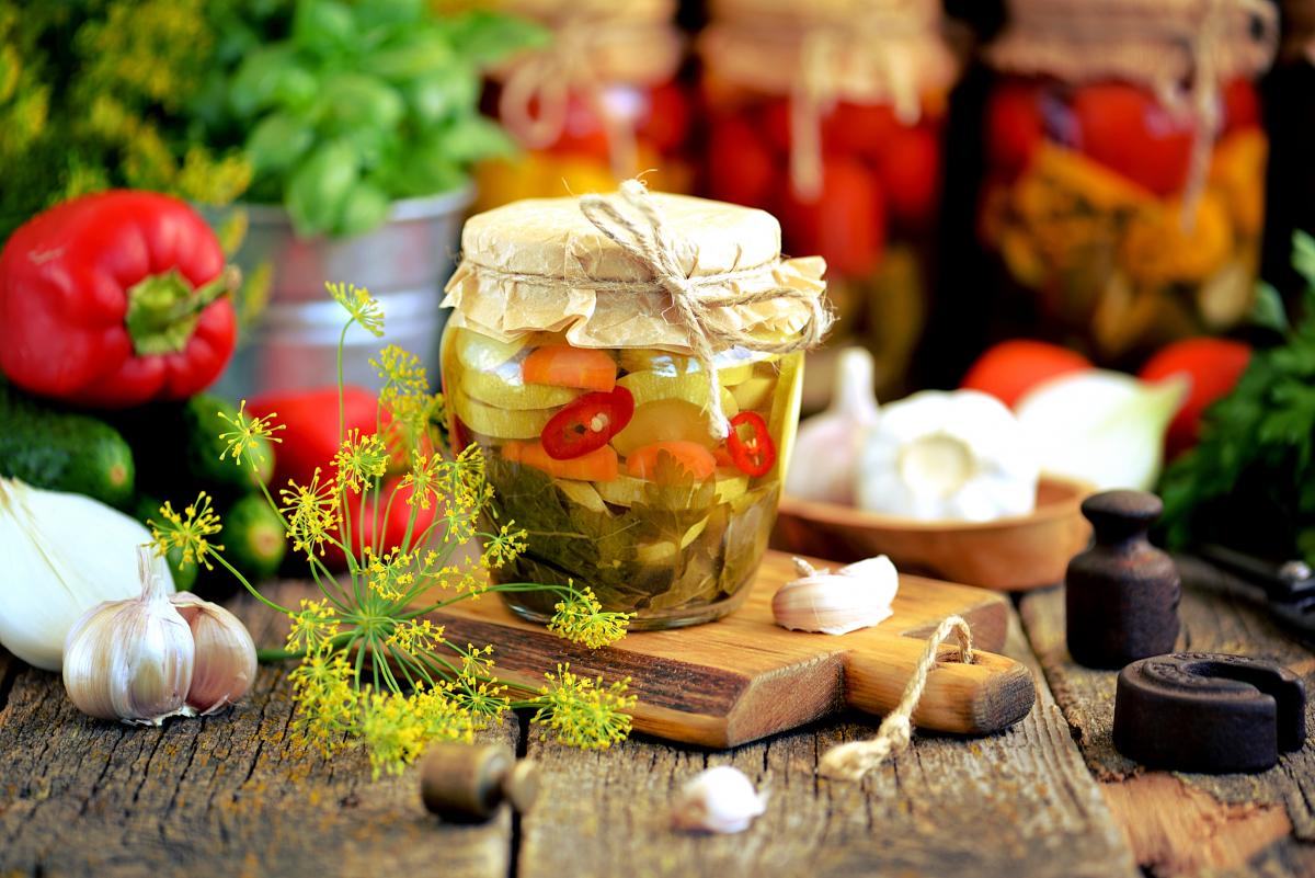 Готовую овощную смесь разложите по чистым стерильным банкам. Утрамбуйте смесь ложкой, чтобы не было пустот. Оставьте в каждой банке 2 см свободного места. Накройте, но не закручивайте обработанными крышками.