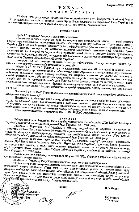 В частности, 22 января Мукачевский горрайоный суд Закарпатской области рассмотрел иск представителя партии «Наша Украина» Игоря КРИЛЯ в Верховную Раду о признании противоправными возможных действий Председателя ВР в случае подписания им закона о Кабмине.