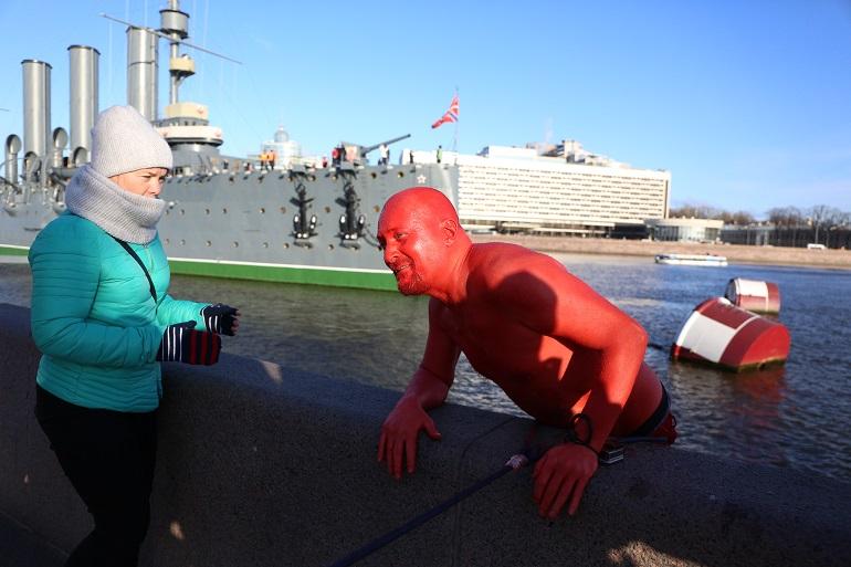 В Санкт-Петербурге арт-группа «Сну-Сну» провела акцию «Купание красного меня». Активист Александр Колпаков выкрасился в красный цвет и искупался возле крейсера «Аврора».