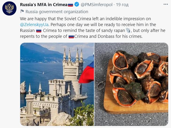 "Мы рады, что советский Крым произвел неизгладимое впечатление на Зеленского. Возможно, когда-нибудь мы будем готовы принять его в российском Крыму, чтобы напомнить вкус песчаного рапана, но только после того, как он покается перед народом "Крыма и Донбасса" в своих преступлениях", - говорится в сообщении российского дипведомства в Twitter.