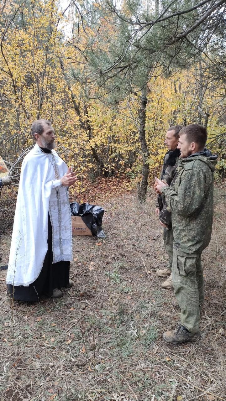 "На поваленное дерево поставили ящик из-под боеприпасов, проложив его изнутри полиэтиленовым мешком. На это же дерево установили большую Казанскую икону Божией Матери. Для ног принесли картонную коробку, которую также проложили мешком", — сообщили с места крещения.