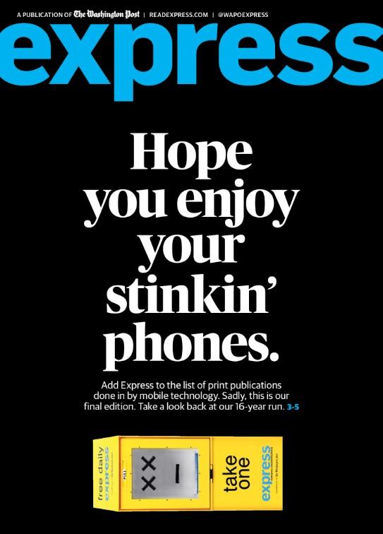 Газета Washington Post Express прекратила свое существование в печатном виде, не выдержав конкуренции с телефоном.