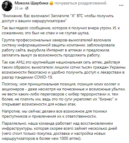 Злоумышленники требовали выкуп за то, чтобы работа аптек вернулась в прежнее русло, поделился в Facebook гендиректор холдинга аптечной сети АНЦ Николай Щербина.
