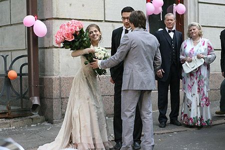 На съемках актер Григорий Антипенко, который на самом деле пылает страстью к другой своей коллеге, должен был облачиться в нарядные очки в строгой черной оправе. Но капризный мачо поначалу не захотел создавать лишнее неудобство для поцелуев, хотя потом его все равно заставили. Пришлось ему и изрядно потрудиться: когда к загсу подъехал белый лимузин с долгожданной прелестницей, освещение было настолько неудачным, что сцену извлечения Пушкаревой из недр авто пришлось переснимать восемь раз. Несчастную девушку то запихивали в салон, то вытаскивали оттуда посредством измученного "жениха", а потом та же тягомотина повторилась на церемонии.