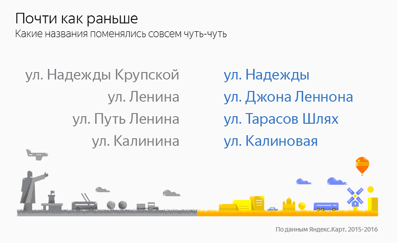 Так, согласно сообщению сервиса Яндекс.Карты, за год в Украине было переименовано более 11 тысяч улиц, причем 10,5 тысячи из них – в связи с декоммунизацией. Больше всего переименований произошло в Днепропетровской области.