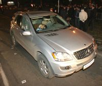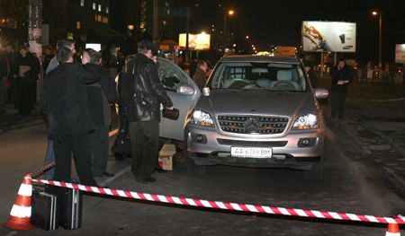 Сотрудники милиции осматривают место убийства Николая Лозинского, убитого в своем автомобиле во Львове в среду, 10 января 2007 г. В этот день около 16 часов в центральной части Львова - на проспекте Вячеслава Черновола - неизвестные расстреляли автомобиль «Мерседес» в котором находился криминальный авторитет, известный как Рокеро.