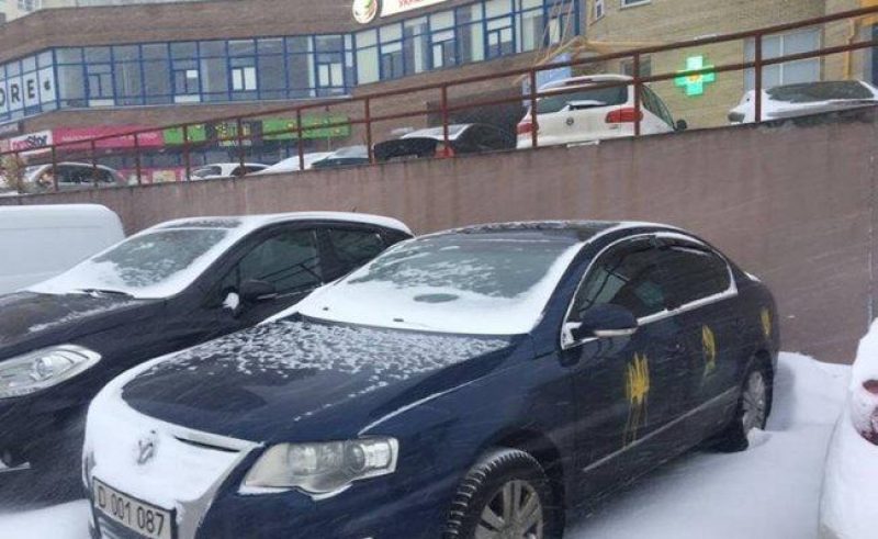 В Киеве автомобили российских дипломатов украсили граффити с украинской символикой.