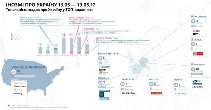 В течение недели 13-19 мая 2017 года подавляющее большинство мировых СМИ активнее всего освещали такие связанные с Украиной новости как проведение в Киеве песенного конкурса Евровидение-2017 и запрет доступа к ряду российских интернет-порталов в Украине. Об этом свидетельствуют результаты исследования, проведенного аналитической группой Corestone.
