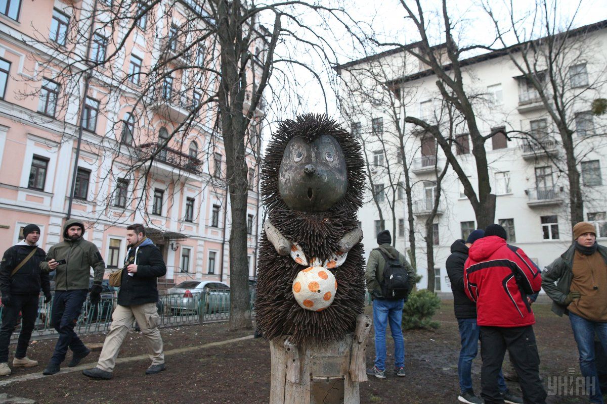 Как передает корреспондент УНИАН, в сквере прошла акция в защиту скульптуры «Ежик в тумане».