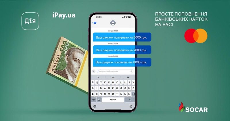 SOCAR и IPay в сотрудничестве с MasterCard внедрили услугу пополнения наличными карты любого банка Украины на всех АЗК SOCAR.
