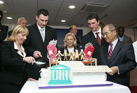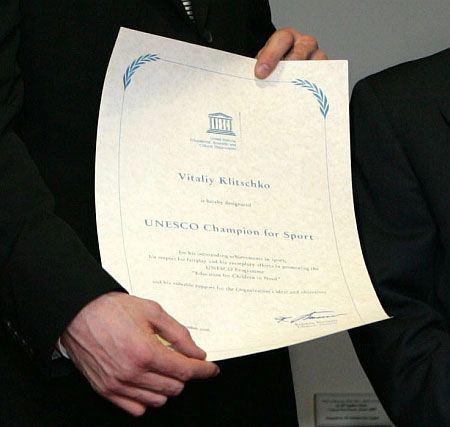 Звание Чемпионов ЮНЕСКО по спорту, как сообщила Организация накануне в коммюнике, присуждено братьям КЛИЧКО за "выдающиеся успехи в боксе, за их постоянную помощь тем, кто в ней нуждается, за их усилия в поддержке Программы ЮНЕСКО по образованию "Дети в беде", за вклад в распространение идеалов Организации".