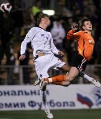 | Алексей Березуцкий (ЦСКА) и Александр Кучер (Шахтер) ведут борьбу за мяч |