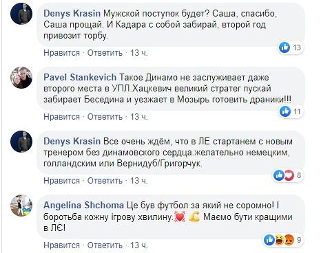 "Мужской поступок будет? Саша, спасибо, Саша прощай. И Кадара с собой забирай, второй год привозит торбу", "Такое "Динамо" не заслуживает даже второго места в УПЛ. Хацкевич, великий стратег, пускай забирает Беседина и уезжает в Мозырь готовить драники", "Все очень ждем, что в ЛЕ стартанем с новым тренером без динамовского сердца. Желательно немецким, голландским или Вернидуб/Григорчук", "С такой игрой и в ЛЕ нечего делать. Собрались на матч - так собрались. Такое ощущение что на выезде играли... Слов нет... Игры тоже нет...", - комментируют болельщики на официальной странице "Динамо" в Facebook.