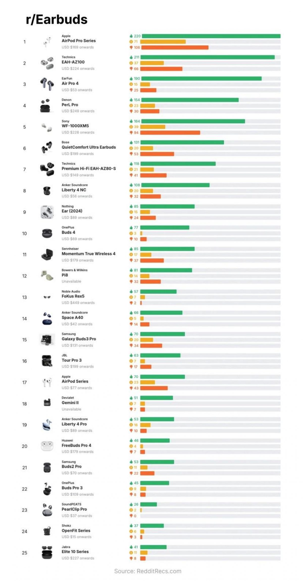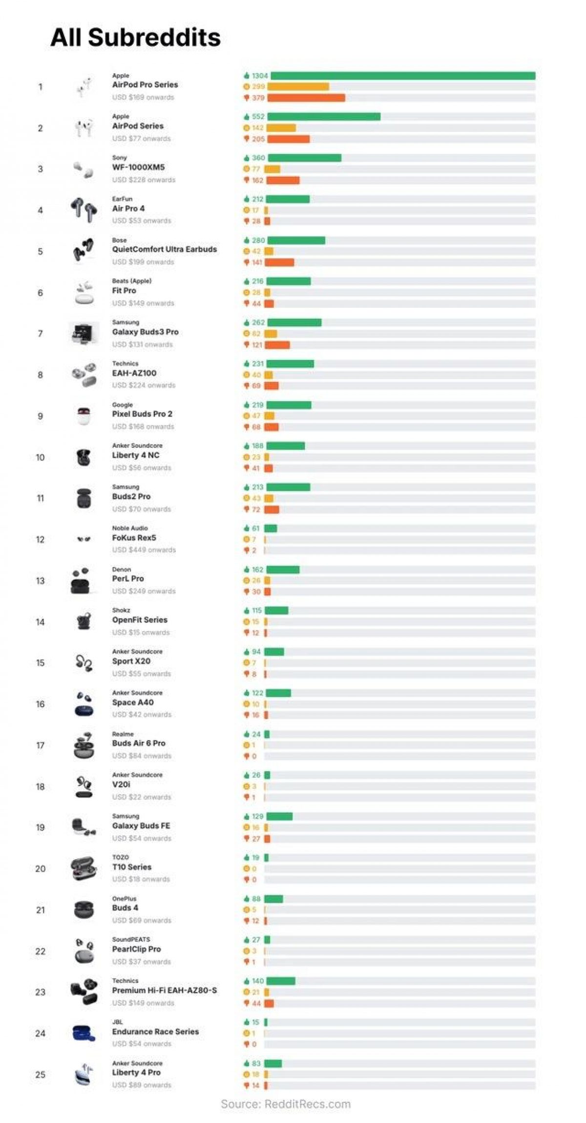 Анализ шел по двум направлениям: отдельно по сабреддиту про наушники и по всему Reddit. И ситуация с профильным сабреддитом другая: например, на втором месте там находятся Technics EAH-AZ100, а на четвертом – Denon PerL Pro.