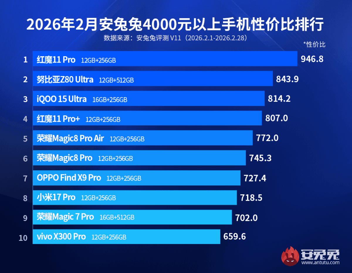 Флагманы. Самый выгодный для приобретения флагман продает Nubiua: ее Red Magic 11 Pro получил топовое актуальное железо и ICE Magic, первую на рынке комбинацию воздушного и водяного охлаждения. На втором и третьем местах – Nubia Z80 Ultra и iQOO 15 Ultra. Все три флагмана базируются на Snapdragon 8 Elite Gen 5.