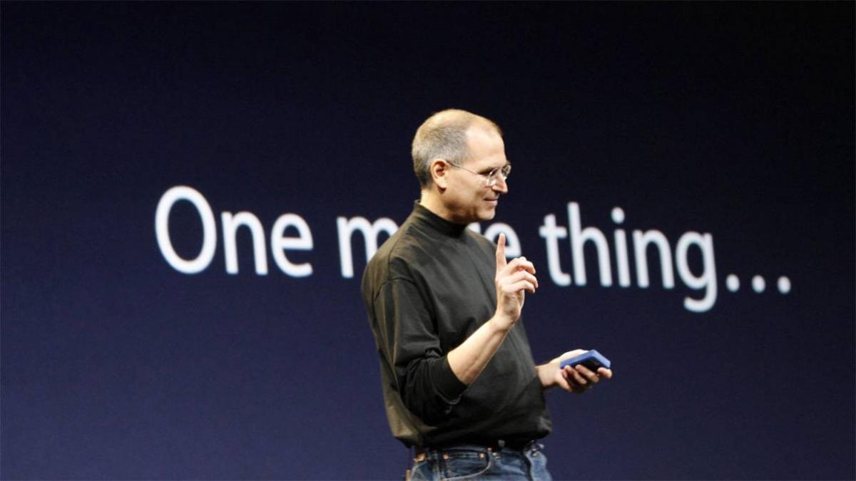 Нейросеть показала постаревшего Джобса в его культовой черной водолазке на фоне сцены Apple с обрезанной надписью "И еще кое-что". Эту фразу традиционно произносил Джобс в конце каждой презентации, представляя какой-нибудь новый продукт компании.