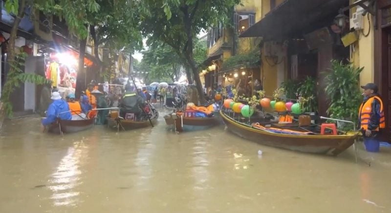 Фотографии, опубликованные в государственных СМИ, показывают, что большая часть Хойана затоплена паводковыми водами, несколько домов затоплены по крыши, и власти эвакуируют туристов на лодках.