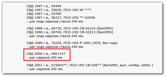 На сайте имеется запись о том что, СВД (7.62-мм снайперская винтовка Драгунова) под номером 0061147 была изготовлена в 2000 году. Последние три цифры серийного номера винтовки Щербы говорят о том, что его винтовка была выпущена позднее, чем указанная на сайте. Стоит так же обратить внимание на новый обвес винтовки: пластиковое цевье и новый пластиковый приклад. По данным из открытых источников, в таком обвесе винтовки стали производить с 1998-1999-хх годов.