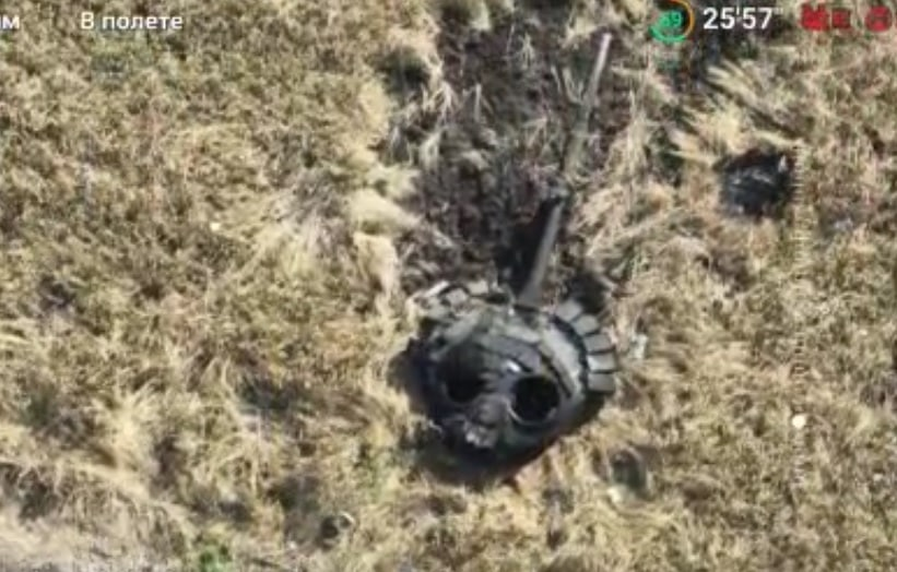 Кроме видео со сгоревшей бронетехникой, волонтер поделился фотографиями, на которых еще одному Т-72 снесло башню под Изюмом от украинской природы.
