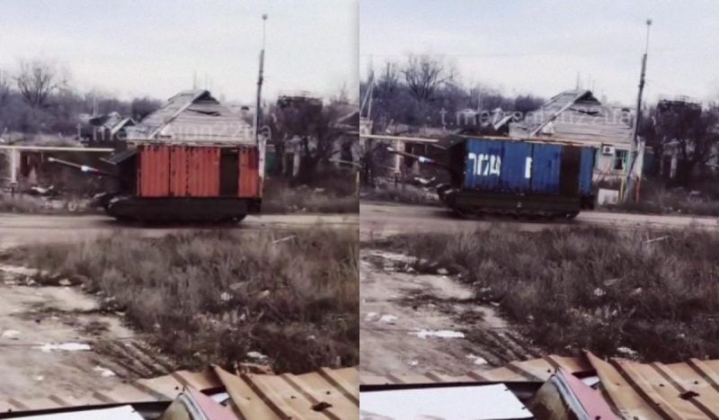 В российской армии заметили новый вариант импровизированной защиты бронетехники. Оккупанты устанавливают морские ISO-контейнеры непосредственно на корпуса танков. Это дополняет уже распространенные на поле боя кустарные надстройки, известные как "сараи" и "мангалы". Видео с такими машинами опубликовал Telegram-канал "Регион 22".