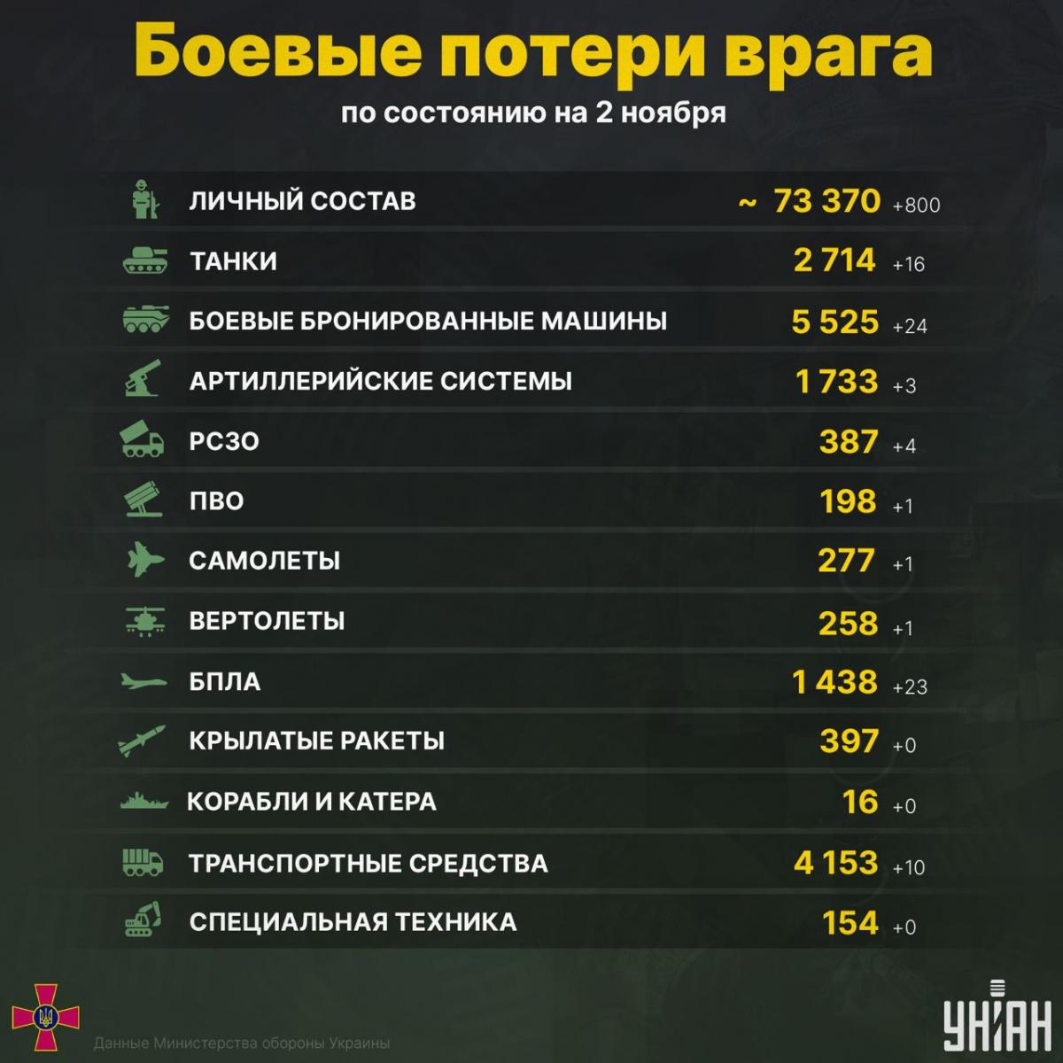 "Общие боевые потери противника с 24.02 по 02.11 ориентировочно составили: личного состава ‒ около 73 270 (+800 за минувшие сутки) ликвидированы", - говорится в сообщении.