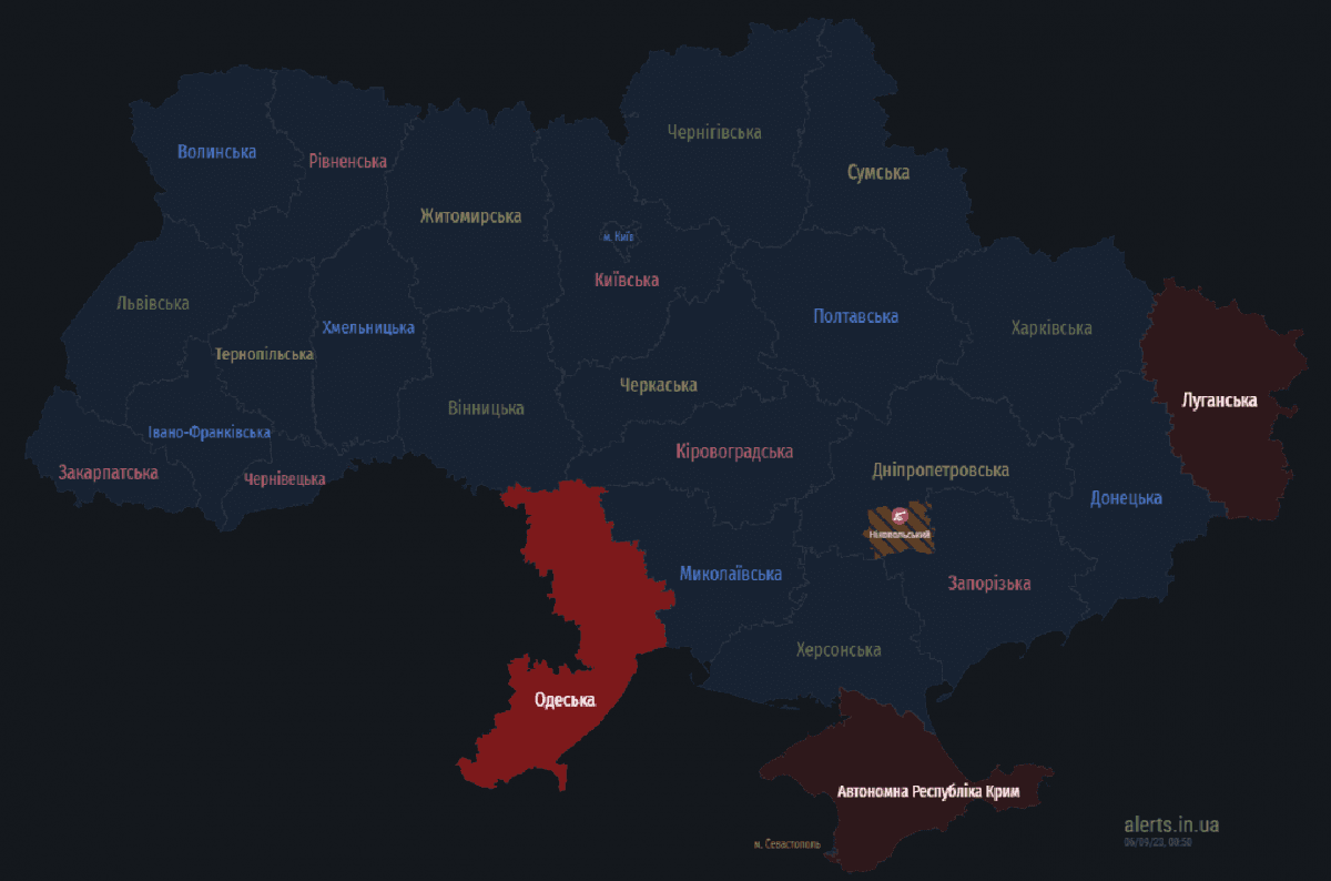 Обновлено в 04:45: Угроза пусков крылатых ракет с российских самолетов Ту-95МС, заявили в Воздушных силах. Так сейчас выглядит карта тревог.