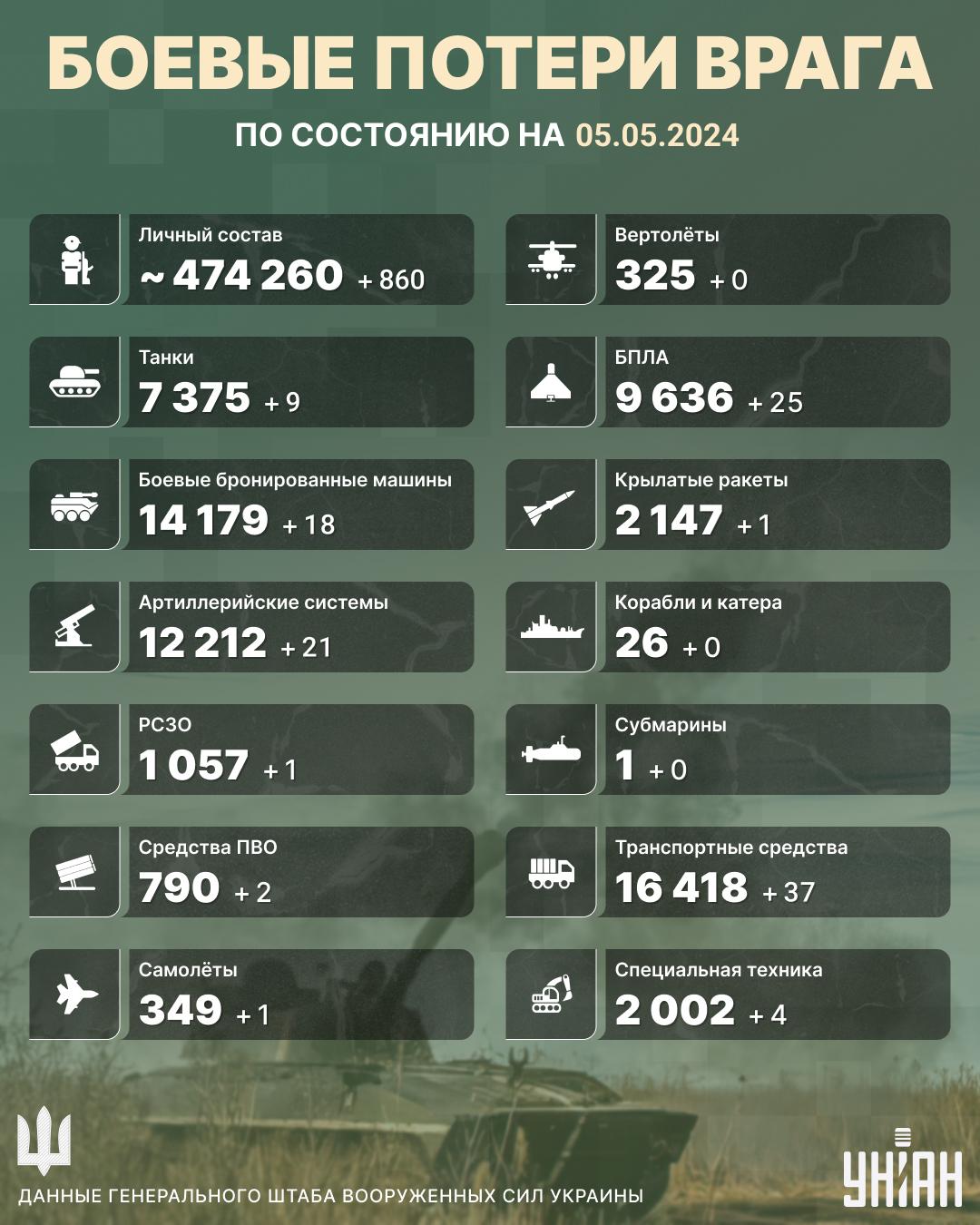 За сутки общие потери России в Украине возросли на 860 противников и теперь составляют 474 260 человек.