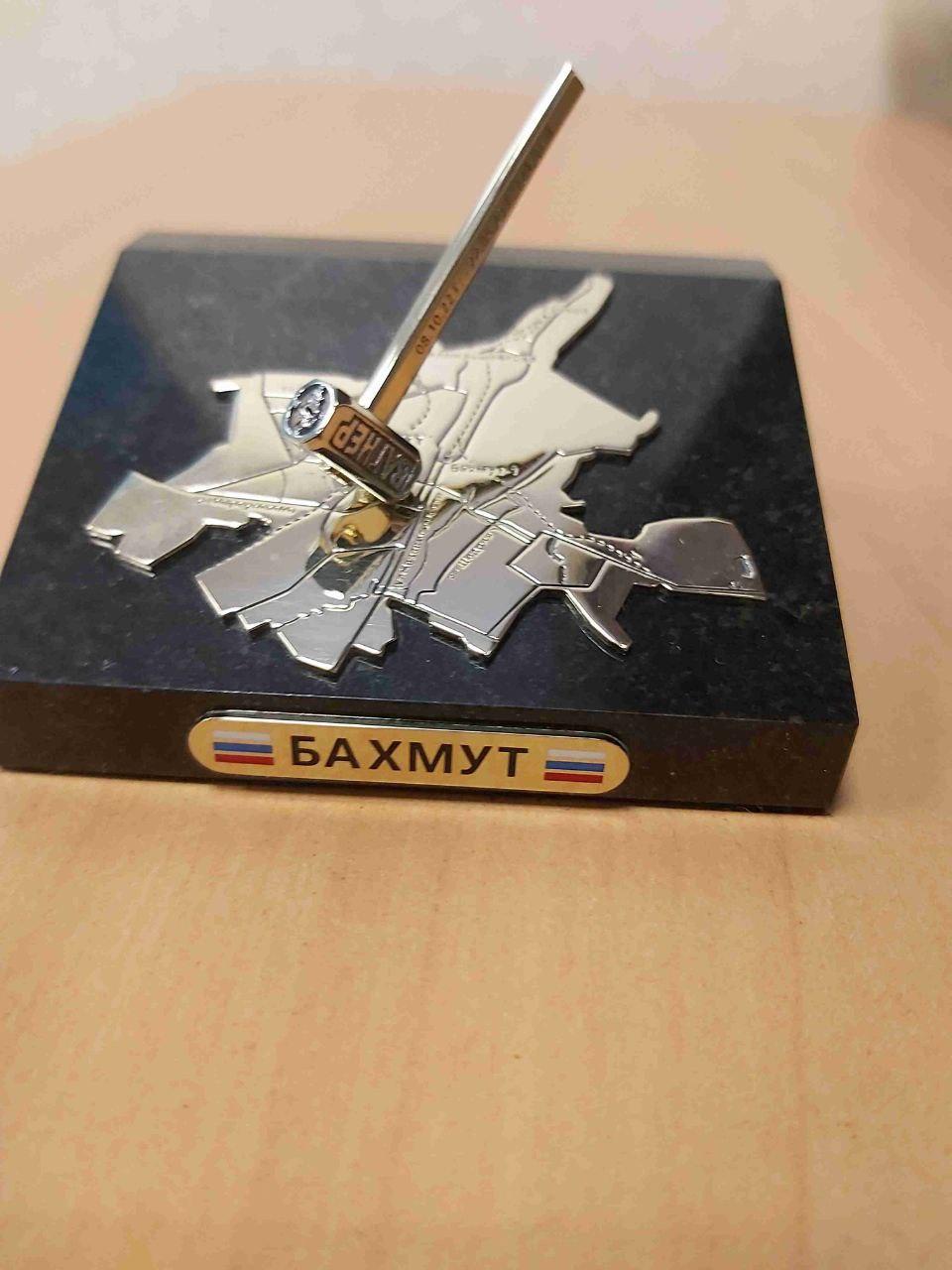 По случаю дня рождения "вагнеровцы "подарили Пригожину статуэтку в форме карты уничтоженного Бахмута Донецкой области, который "разбивает" кувалда "Вагнера". Подписана статуэтка словом "Бахмут" с русскими триколорами рядом.