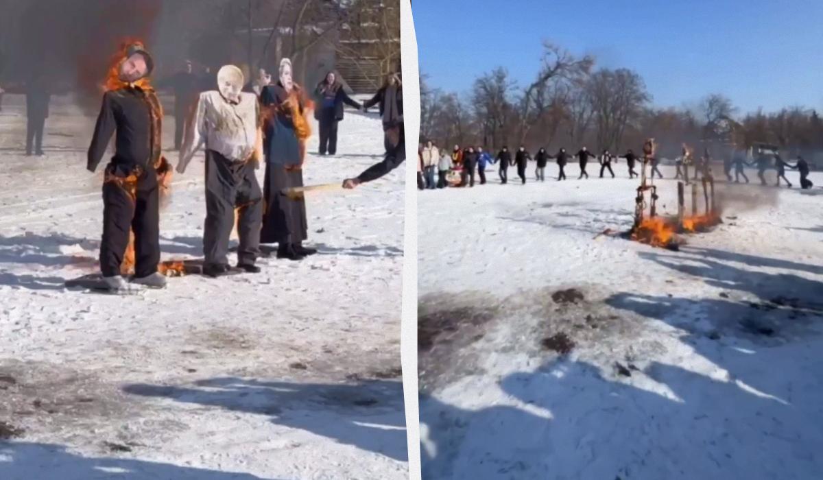 Донецкие Telegram-каналы пишут, что сейчас в центре Донецке проходит "масленичная неделя", и как раз 27 февраля начались самые активные гуляния. Неизвестный, очевидно, один из организаторов говорит, что в ходе "праздника" раздавали публике блины и теплый чай, а "апогеем" стало сожжение.