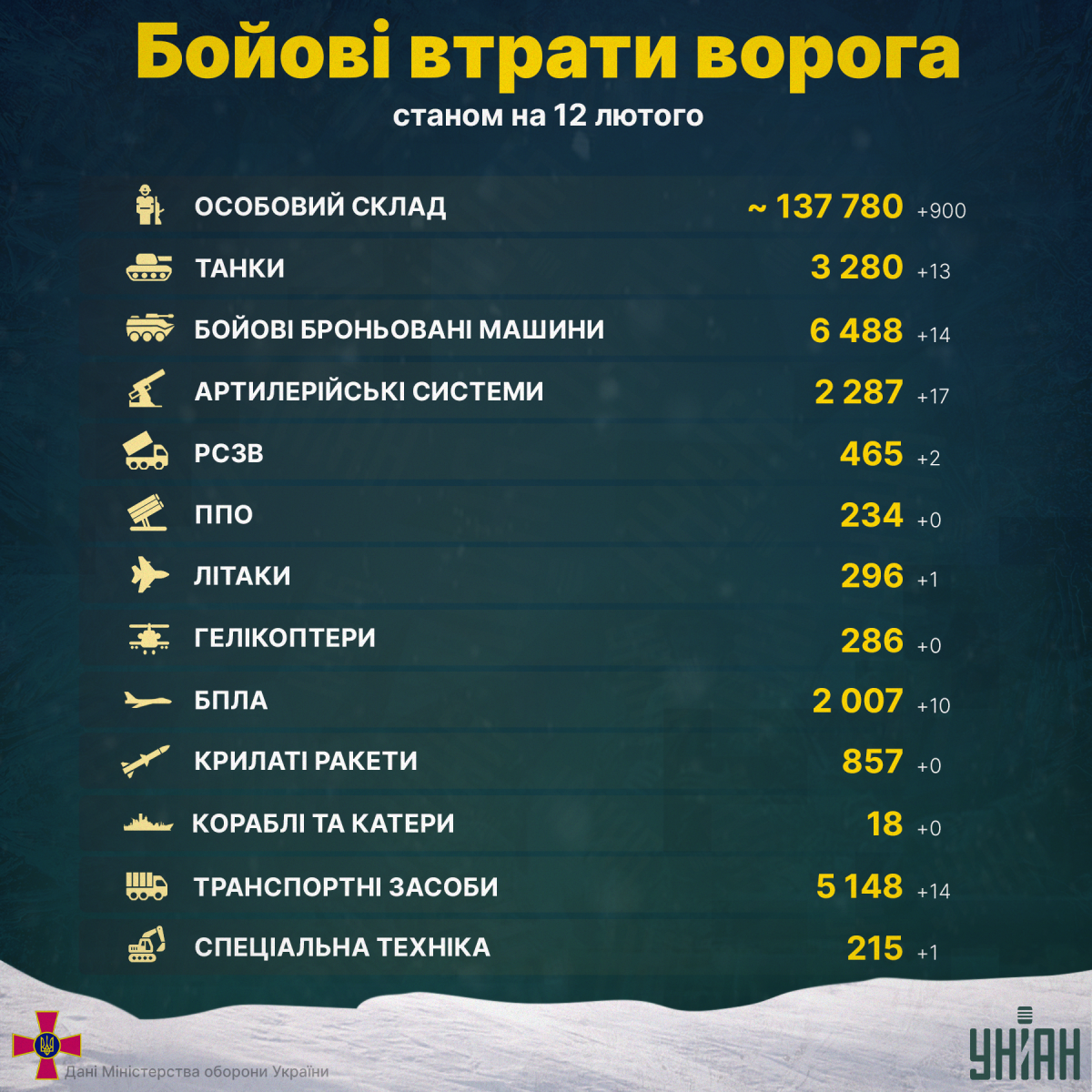 Как сообщает Генеральный штаб ВСУ, общие боевые потери противника с 24.02.22 по 12.02.23 ориентировочно составляли 137780 (+900 оккупантов за минувшие сутки).