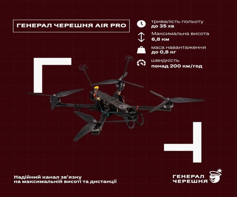 "Генерал Черешня AIR Pro сохраняет одно из ключевых преимуществ предыдущей модели - лучшее соотношение стоимости и результативности на рынке. Один дрон стоимостью 47900 грн способен сбить вражеский летательный аппарат стоимостью более $300 000", - говорится в сообщении.