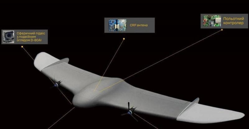 Для навигации в условиях противодействия РЭБ используется четырехканальная CRP-антенна, а движение беспилотника обеспечивают два электродвигателя SunnySky китайского производства, установленные на консолях крыльев.