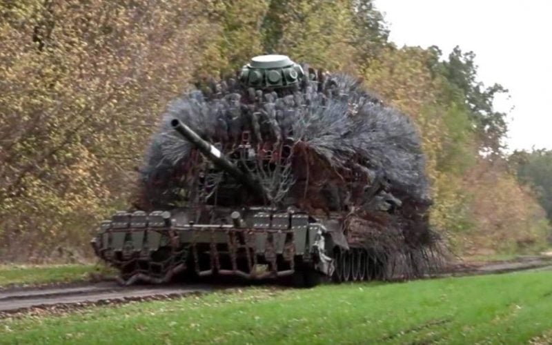 Речь идет о многослойной конструкции из гибких металлических стержней, сваренных в древовидную форму и покрытых высокопрочной сеткой. Она должна создавать трехмерный барьер вокруг танка и заставлять дроны взрываться на расстоянии от корпуса.