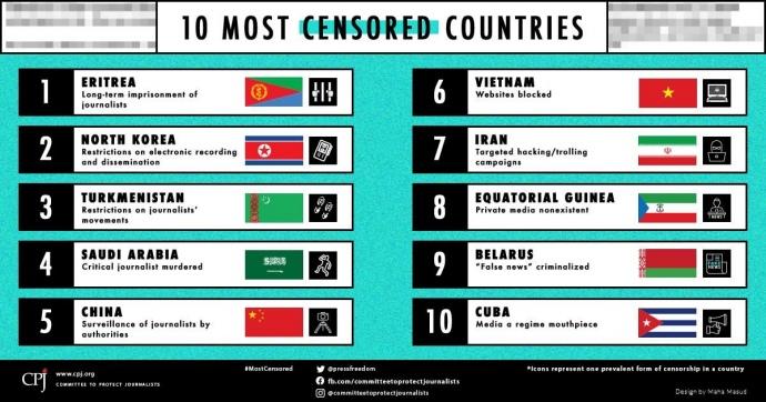 "Эти 10 стран попирают международный стандарт, запрещая или жестко ограничивая независимые средства массовой информации и запугивая журналистов, заставляя их замолчать с помощью тюремного заключения, цифровой и физической слежки и других форм преследования. Самоцензура является широко распространенным явлением.