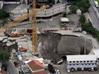 Автомашина рухнула в 30-метровый провал. Прибывшие на место происшествия спасатели пытаются обнаружить микроавтобус, но поисковой операции препятствует опасность повторного обрушения сводов станции.