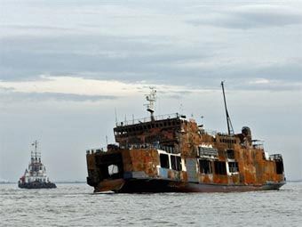 | Паром ”Левина I” на буксире после пожара. Фото AFP |