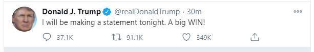 «Сегодня вечером я сделаю заявление. Большая победа!» - написал Трамп.